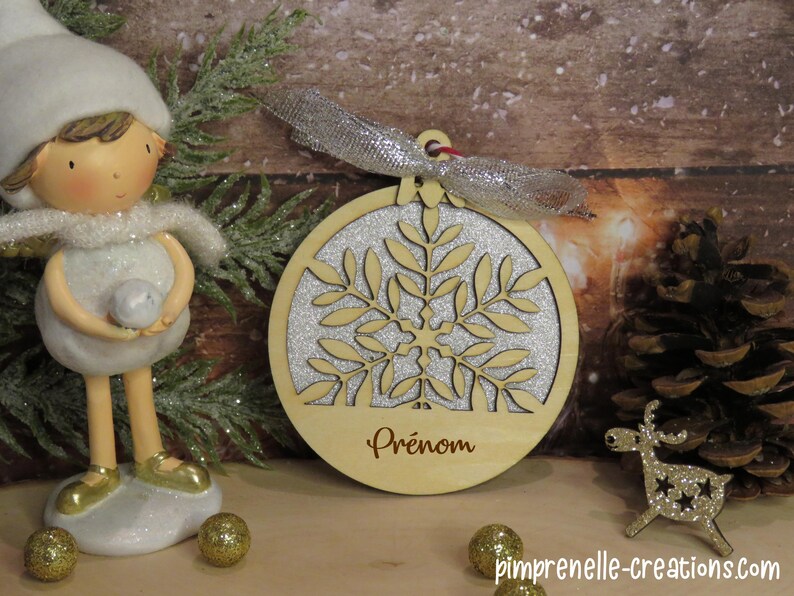 Boule de noël flocon argent avec le prénom de votre choix gravé sur la boule