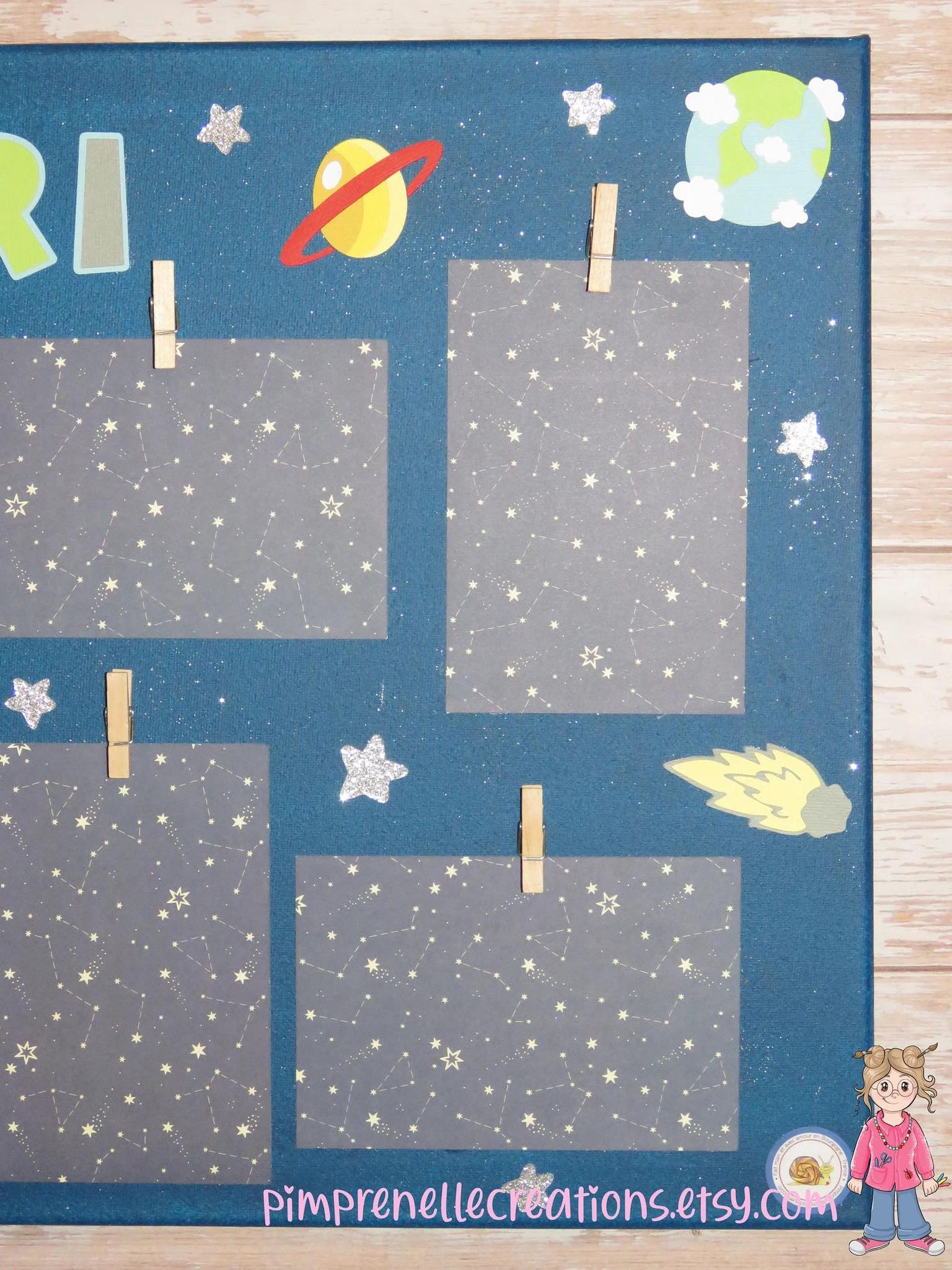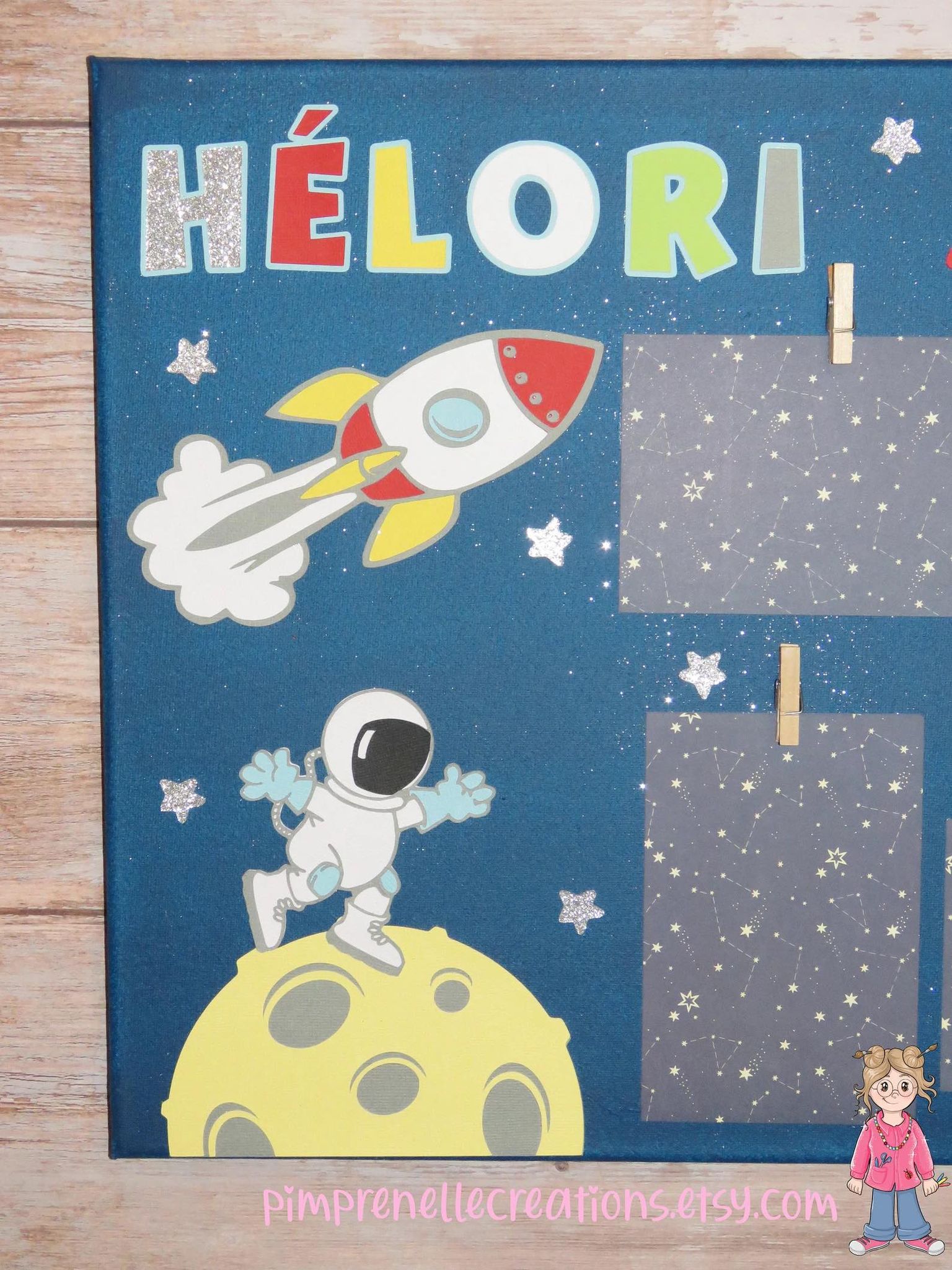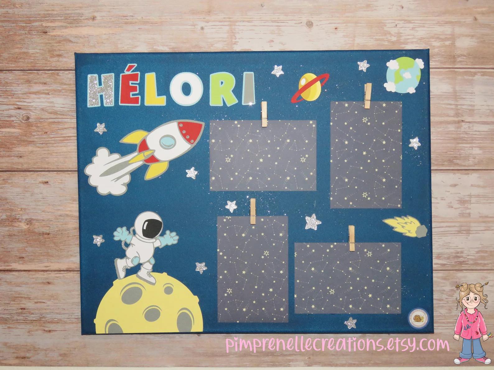 Pêle mêle photos astronaute et espace avec prénom, cadre photos pour chambre décorée sur le thème de l’espace et des planètes.