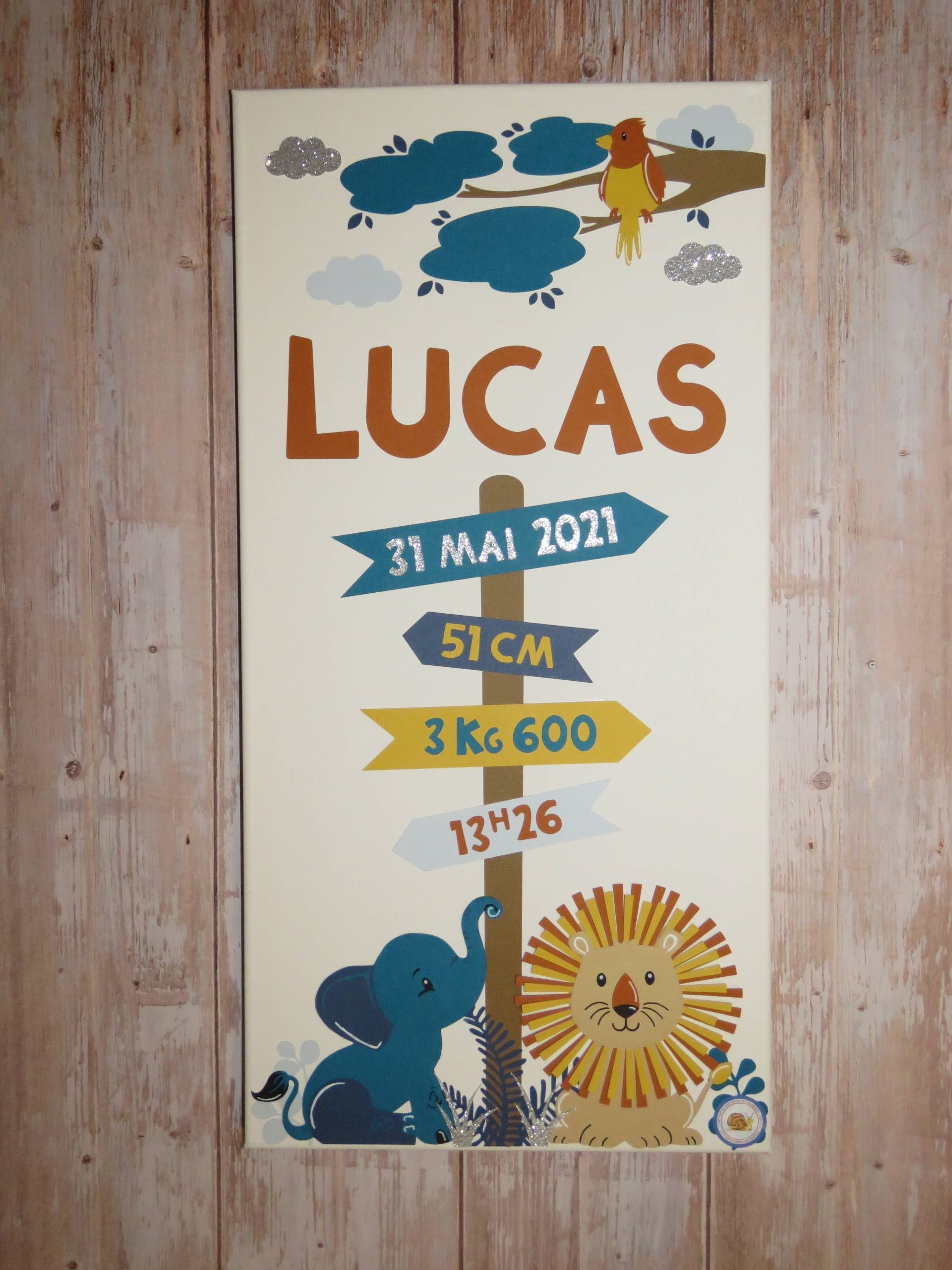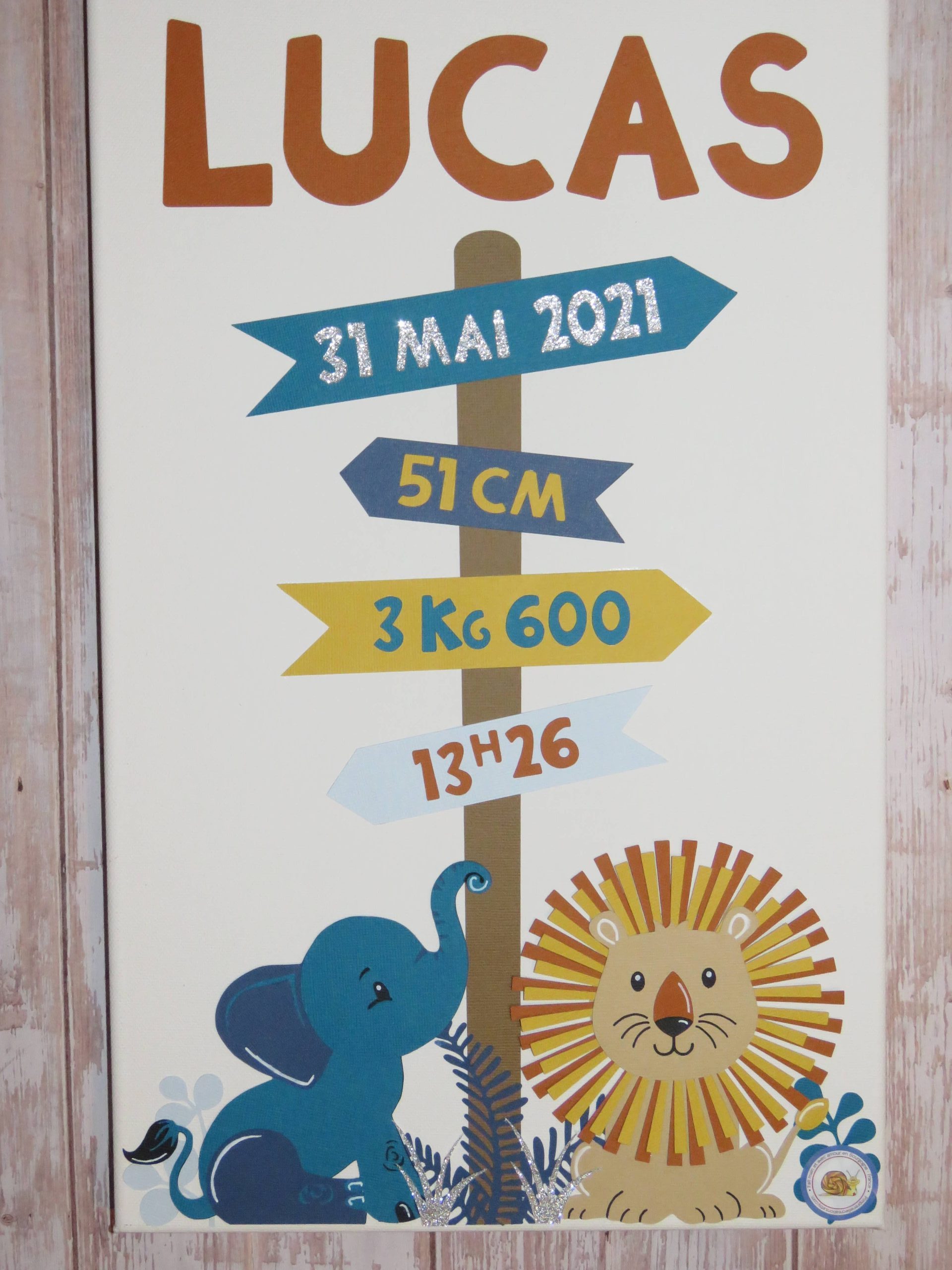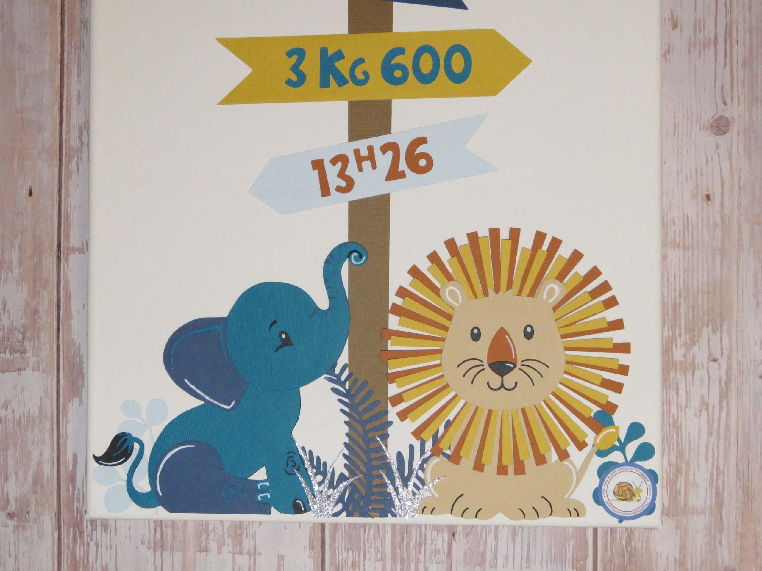 Tableau souvenirs de naissance personnalisé avec éléphant et Lion; affiche avec informations de naissance et prénom. idée de Cadeau de naissance Lion et girafe personnalisé. Tableau inspiré de la collection Sous mon baobab de Moulin Roti.