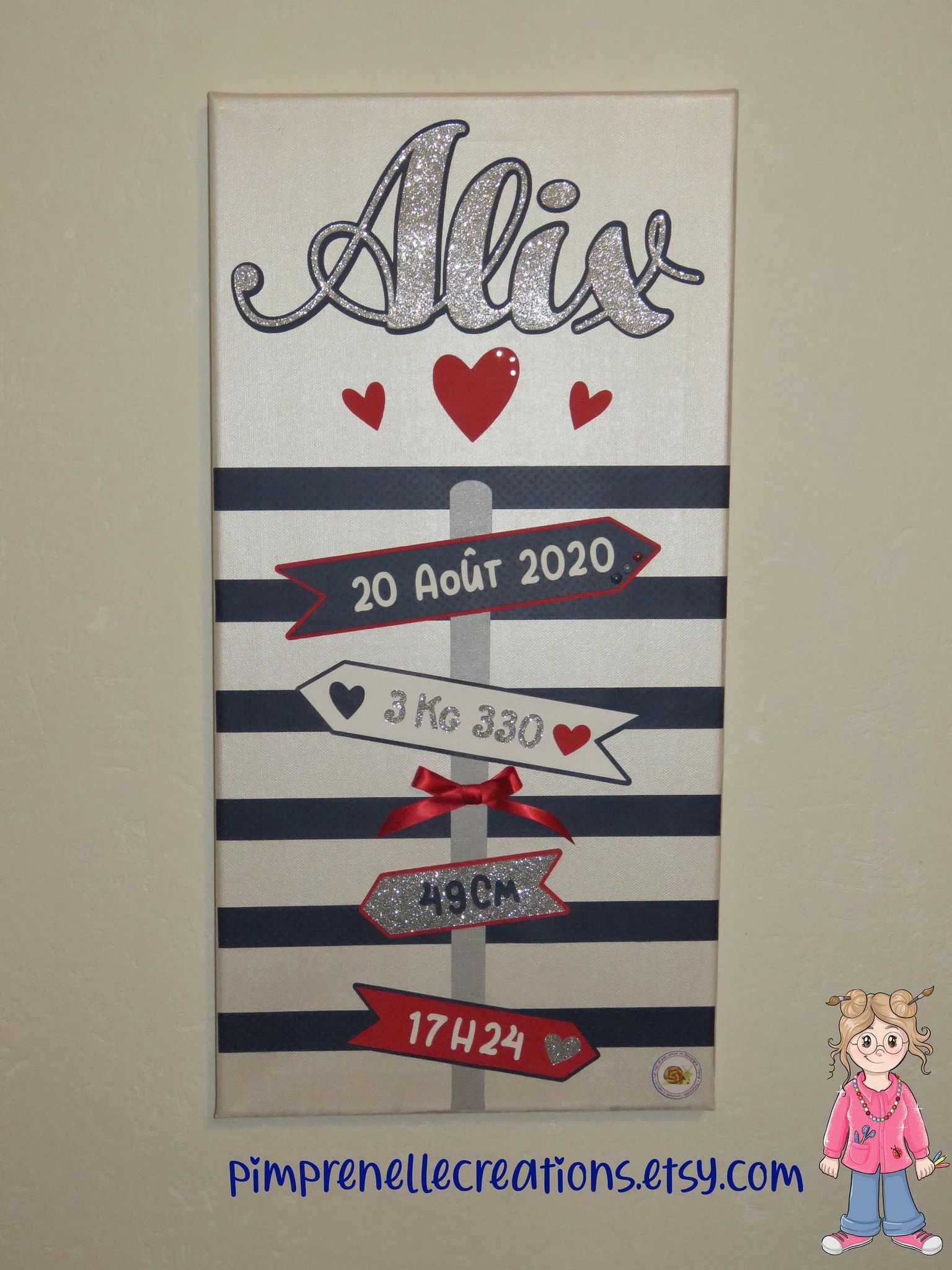 Tableau souvenirs de naissance personnalisé avec rayures blanche et bleu marine;