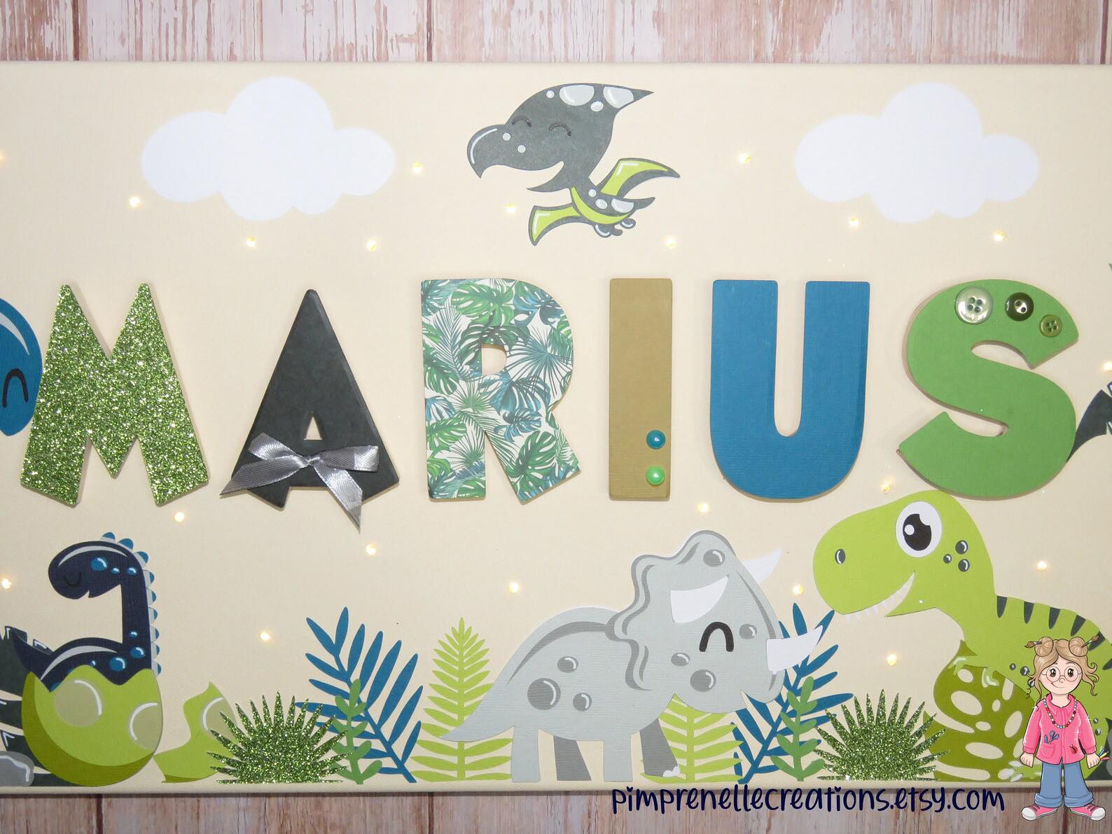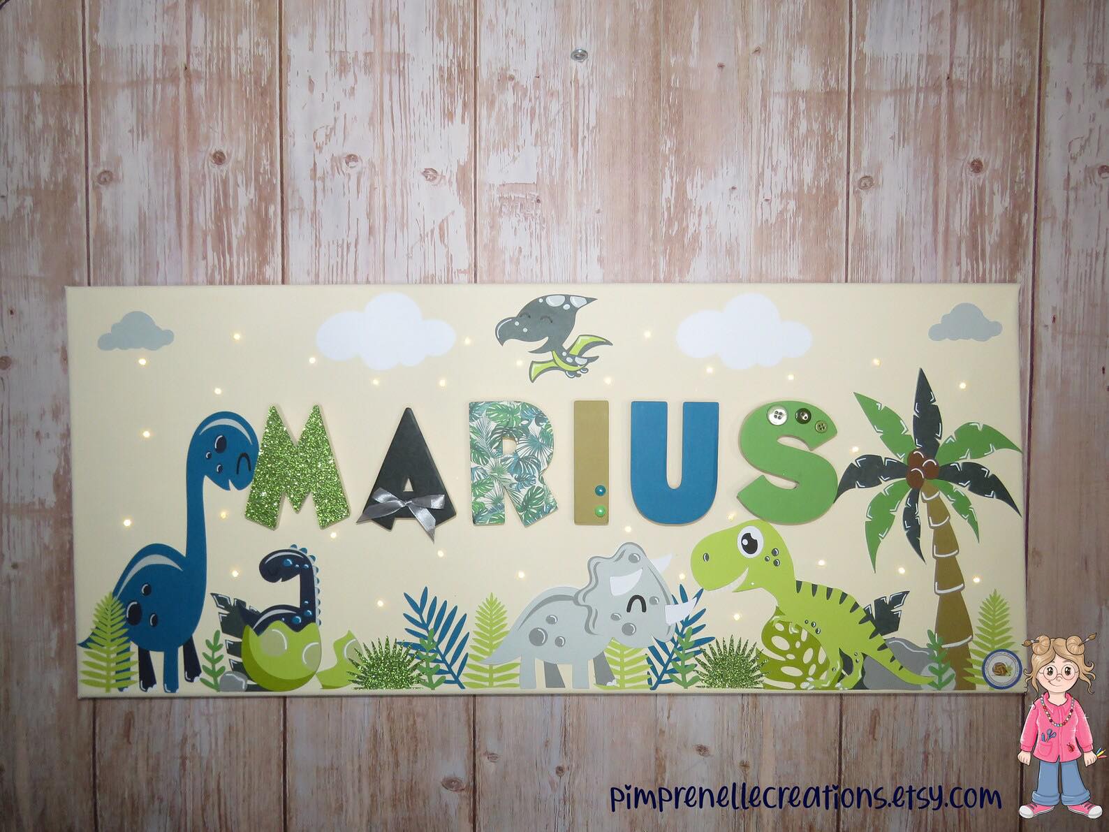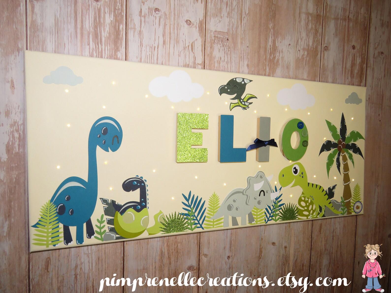 Tableau lumineux avec prénom et dinosaures vert, gris et bleu canard. Toile lumineuse avec prénom et diplodocus .