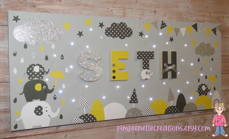 Tableau lumineux avec prénom et éléphant babyfan. Toile lumineuse avec prénom éléphant et collines.
