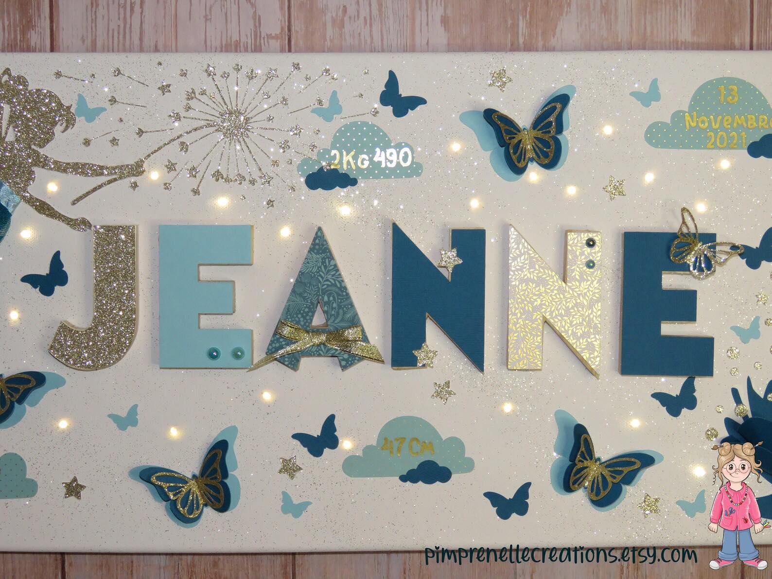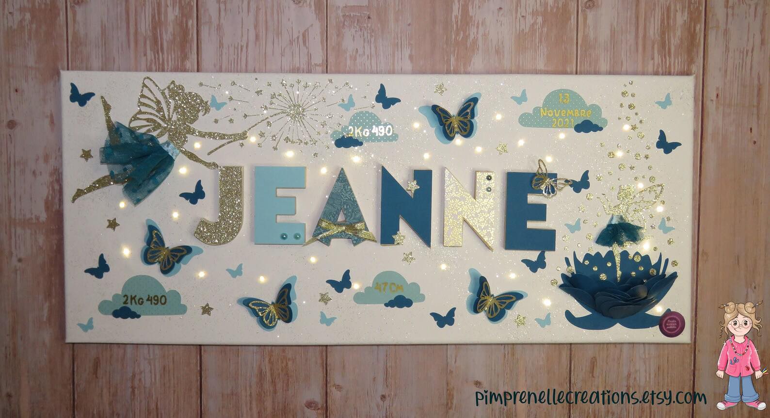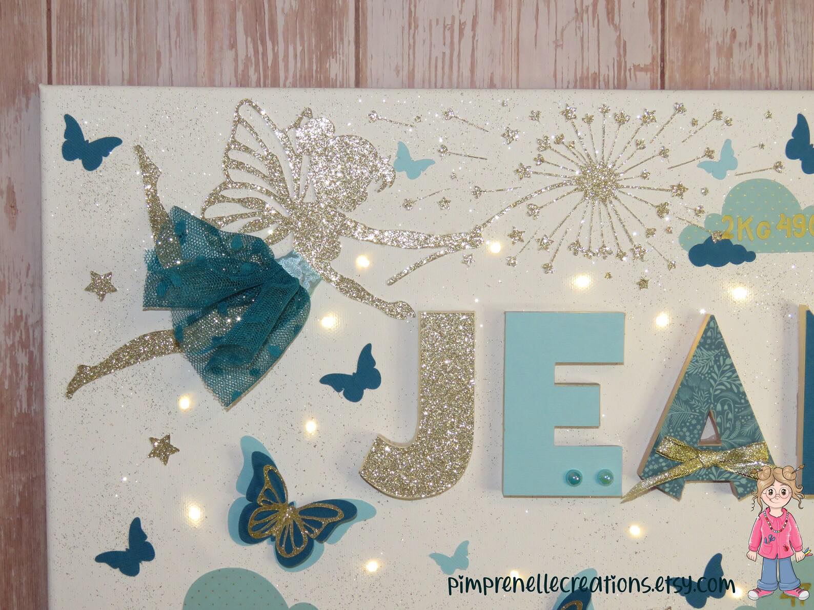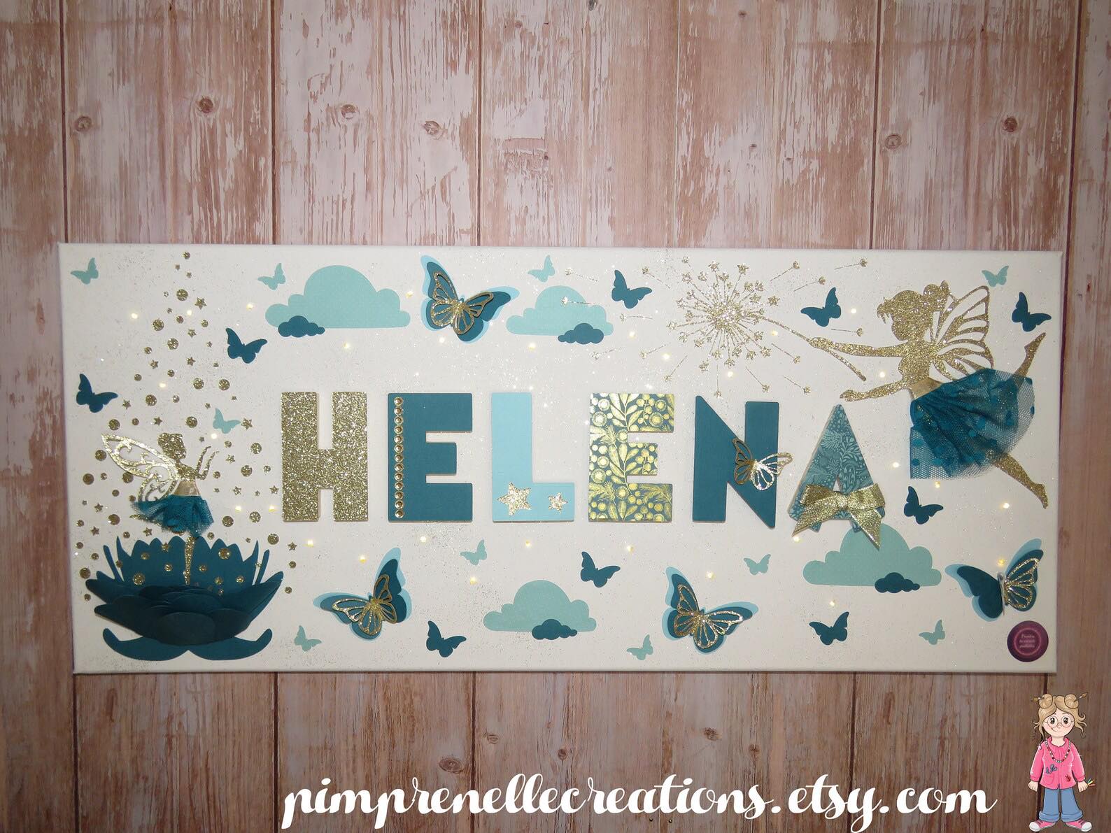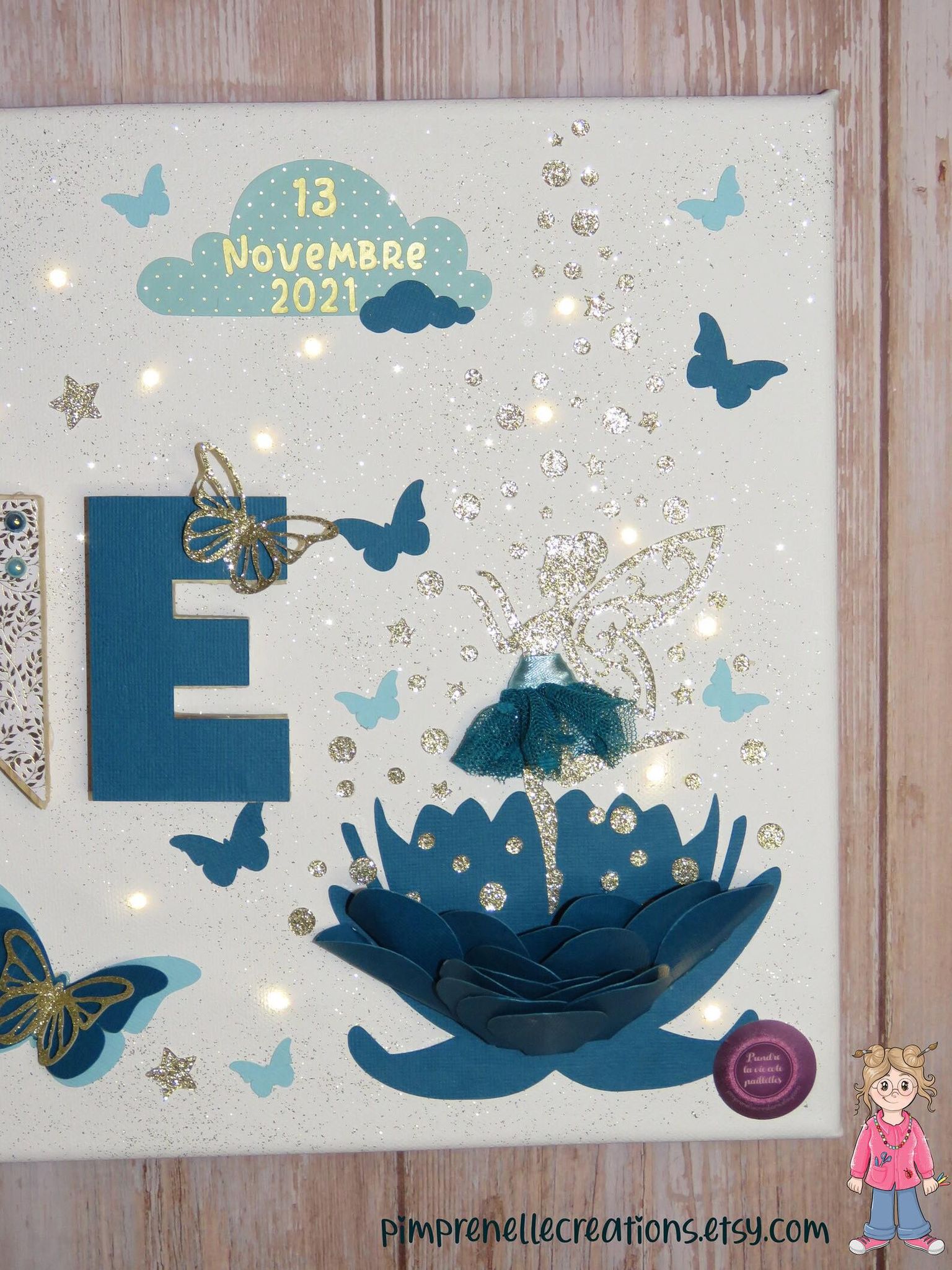 Tableau lumineux avec fées et fleurs bleu canard et doré. Toile lumineuse avec prénom et fées, pissenlits et fleurs.