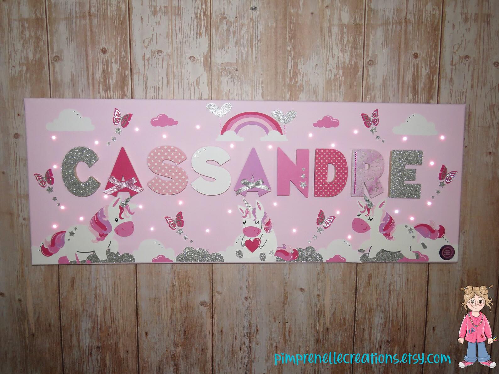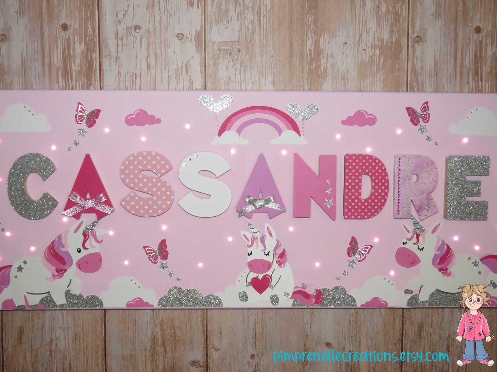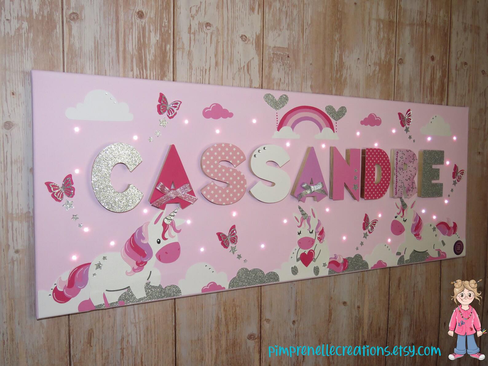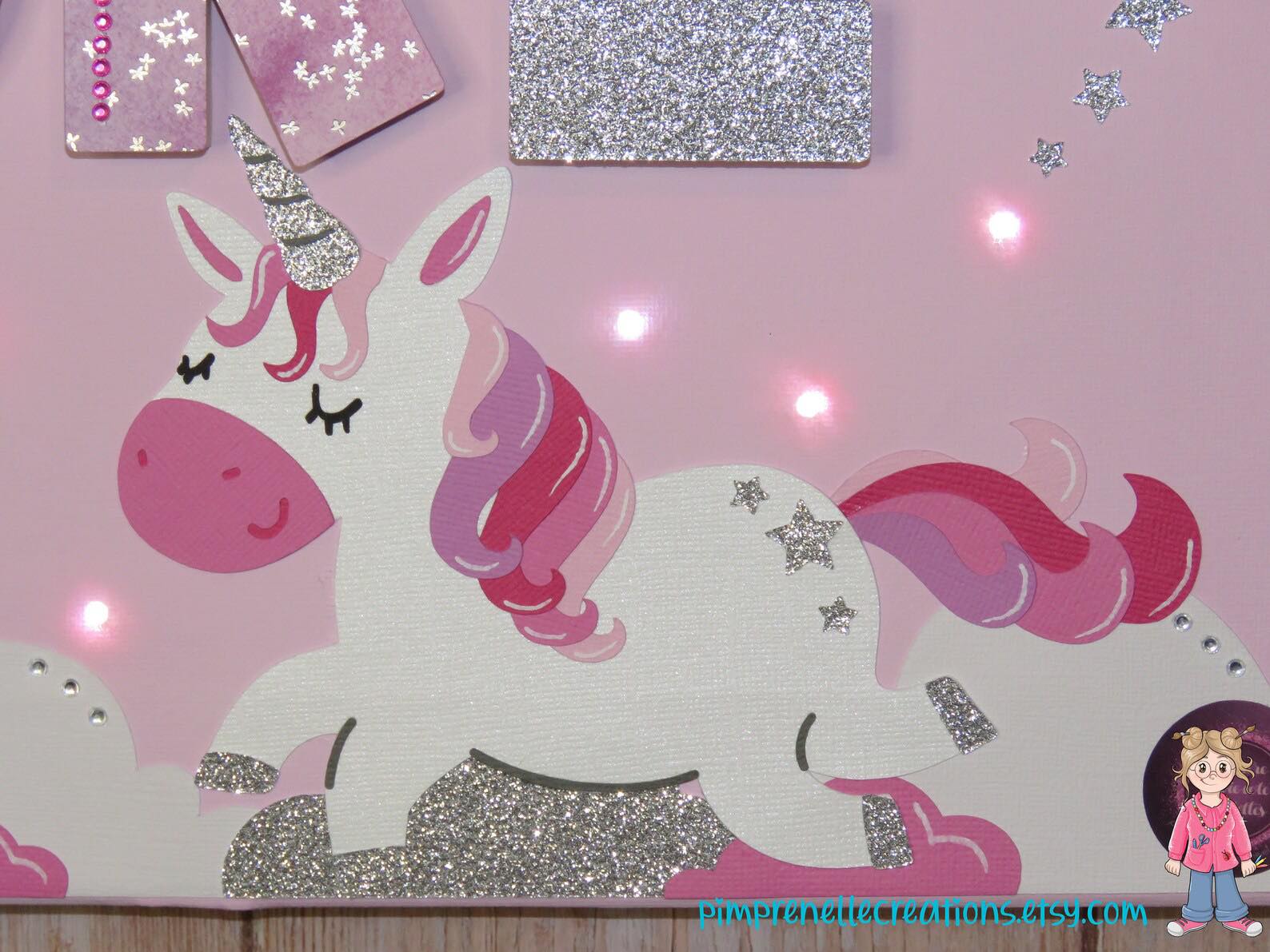 Tableau lumineux avec prénom et petites licornes dans les nuages. Toile lumineuse avec prénom et licornes rose.