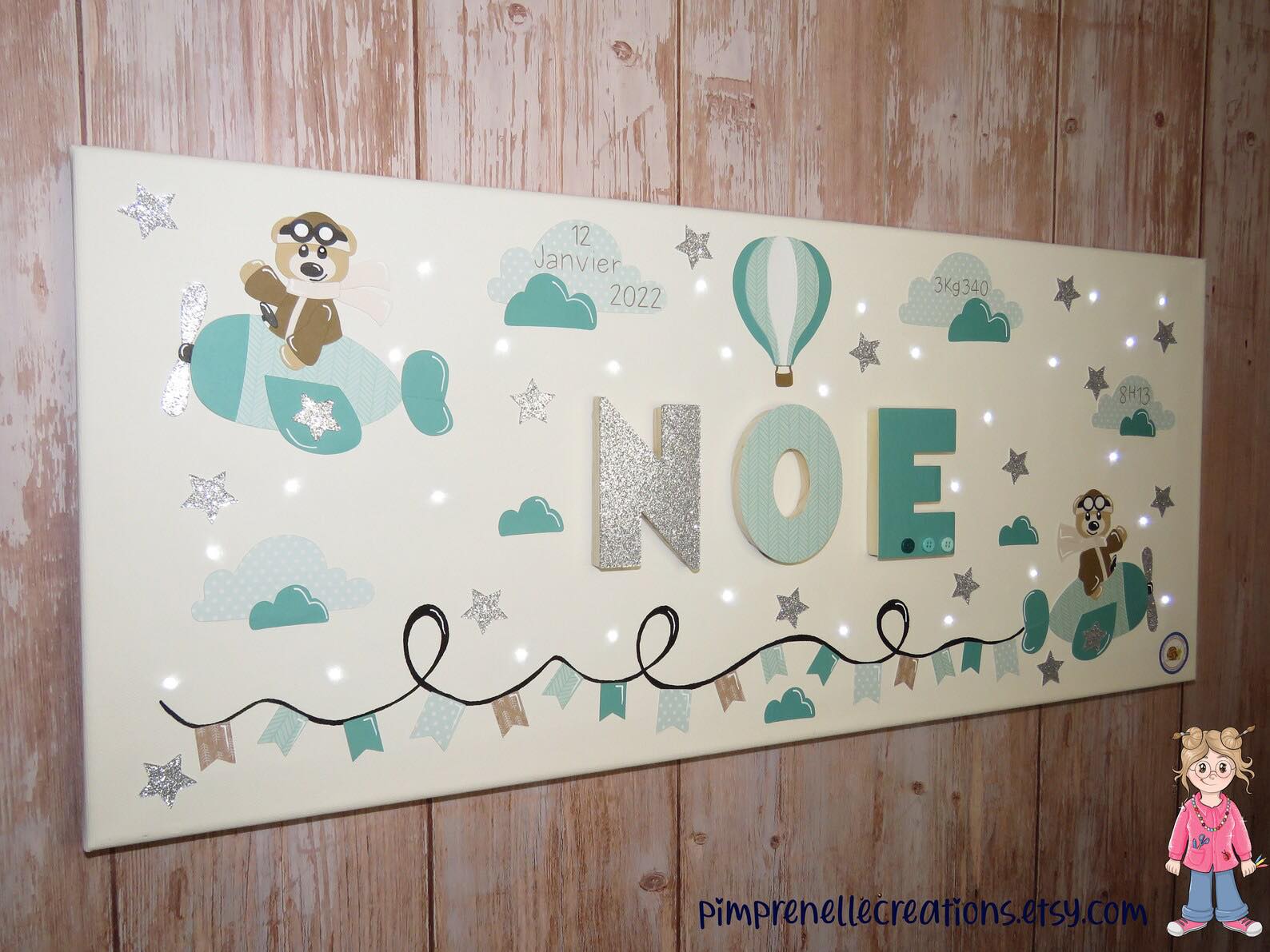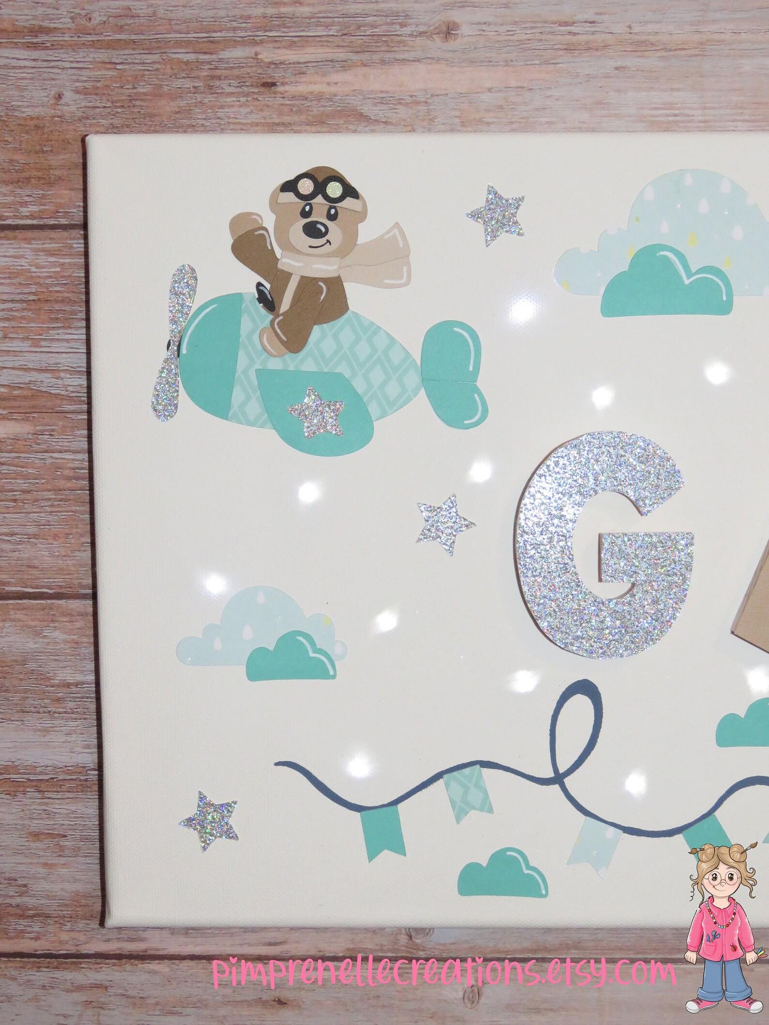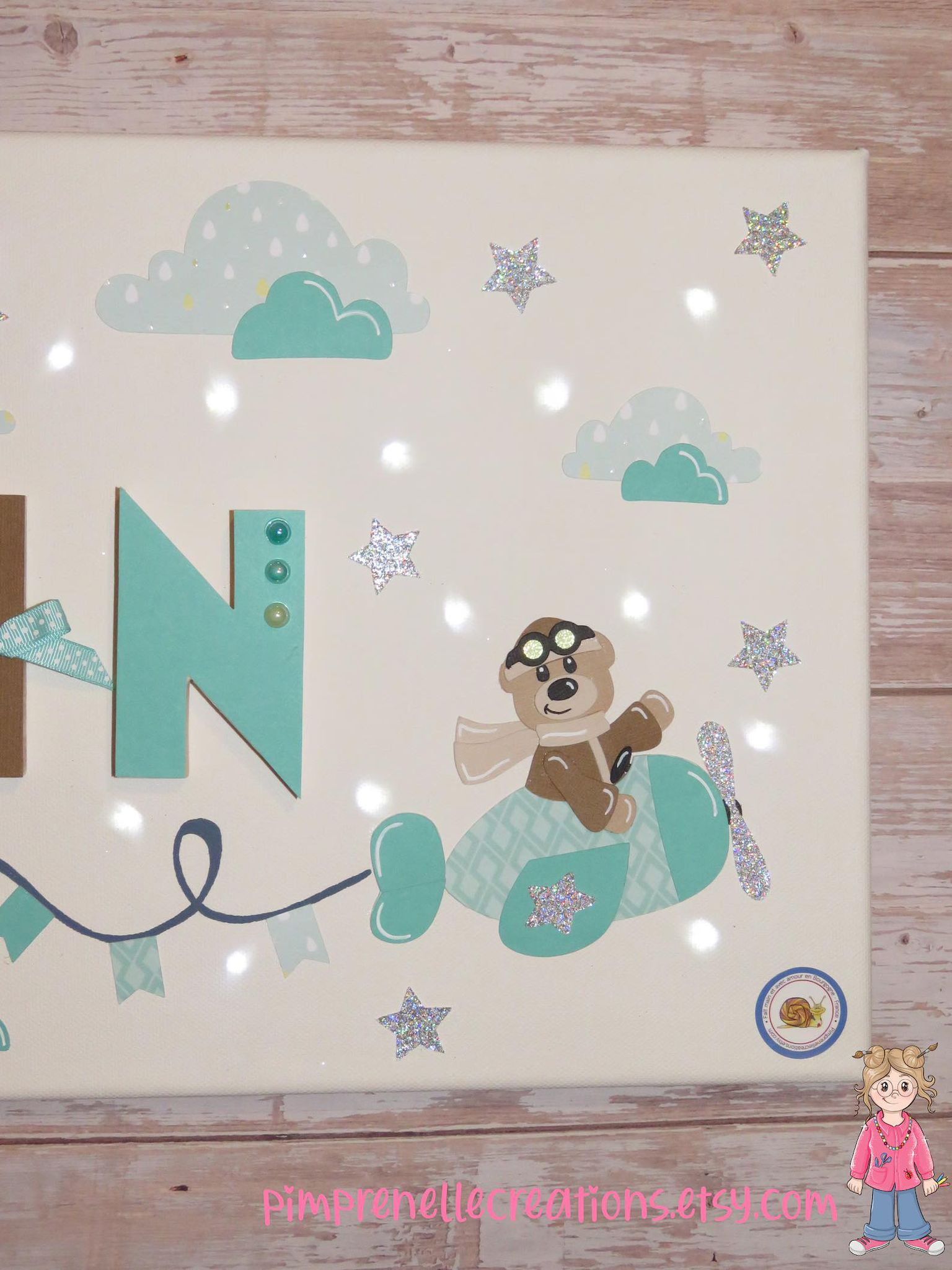 Tableau lumineux avec prénom et doudou ourson Lazare. Toile lumineuse avec prénom doudou Ours dans son petit avion.