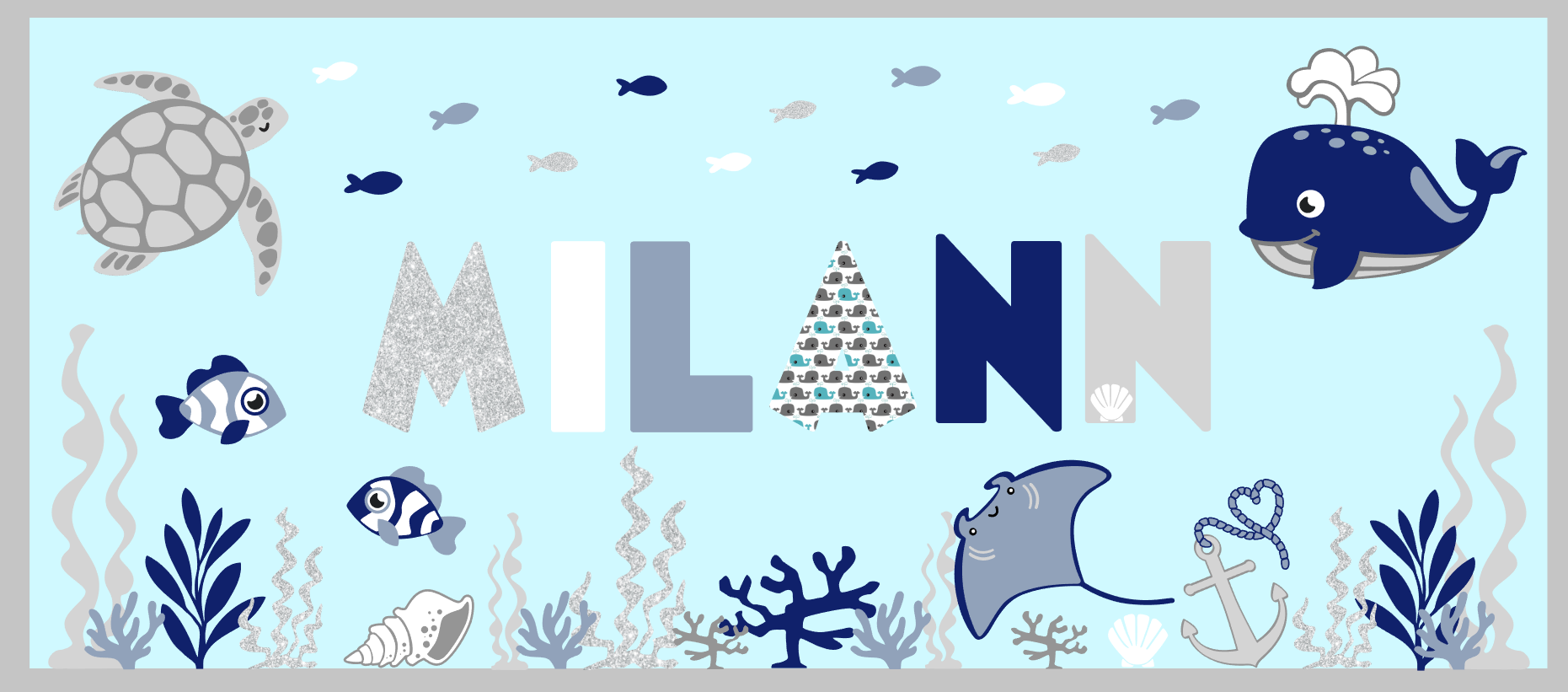 Tableau lumineux avec prénom et fond marin avec poissons baleine et tortue