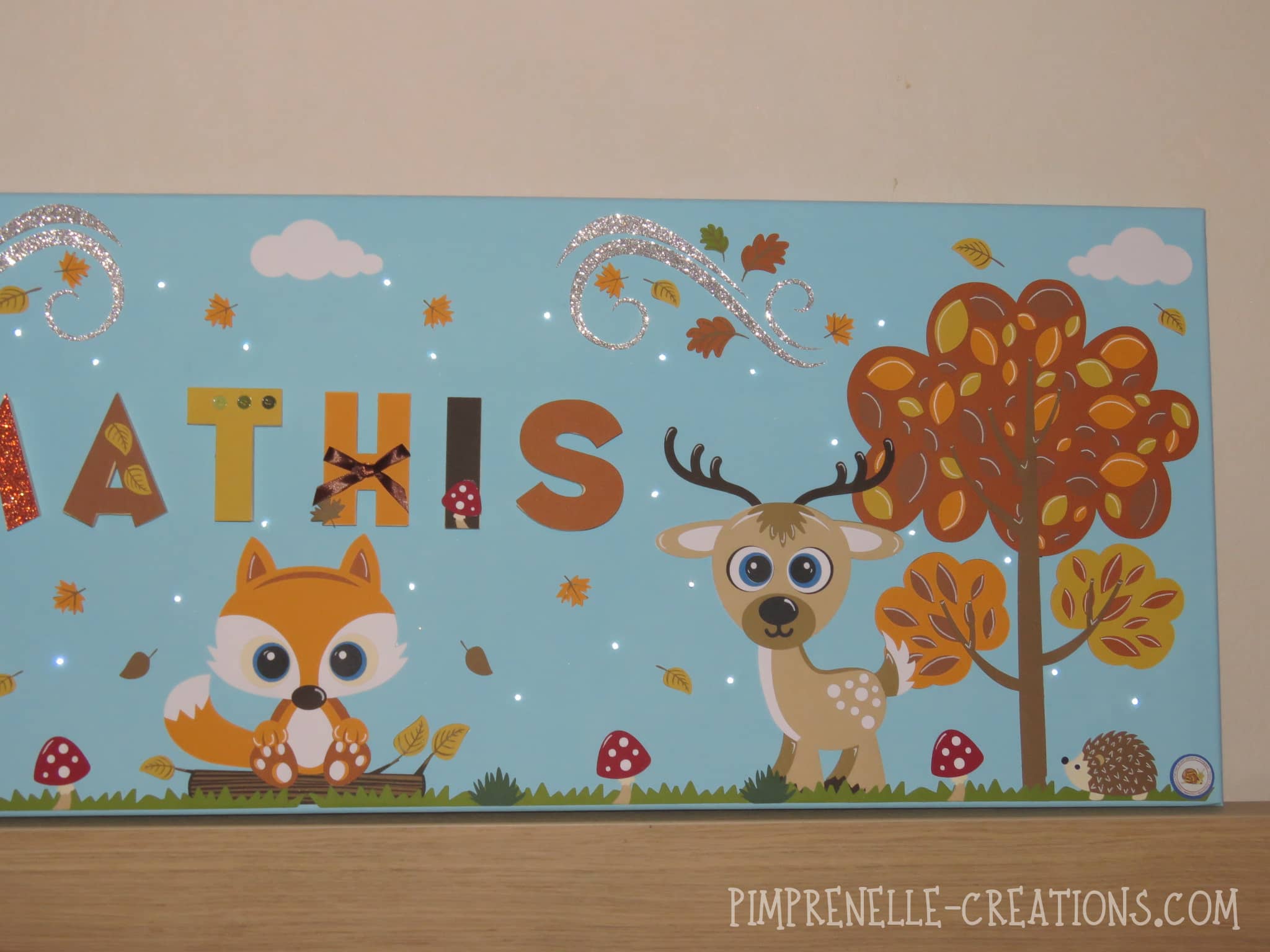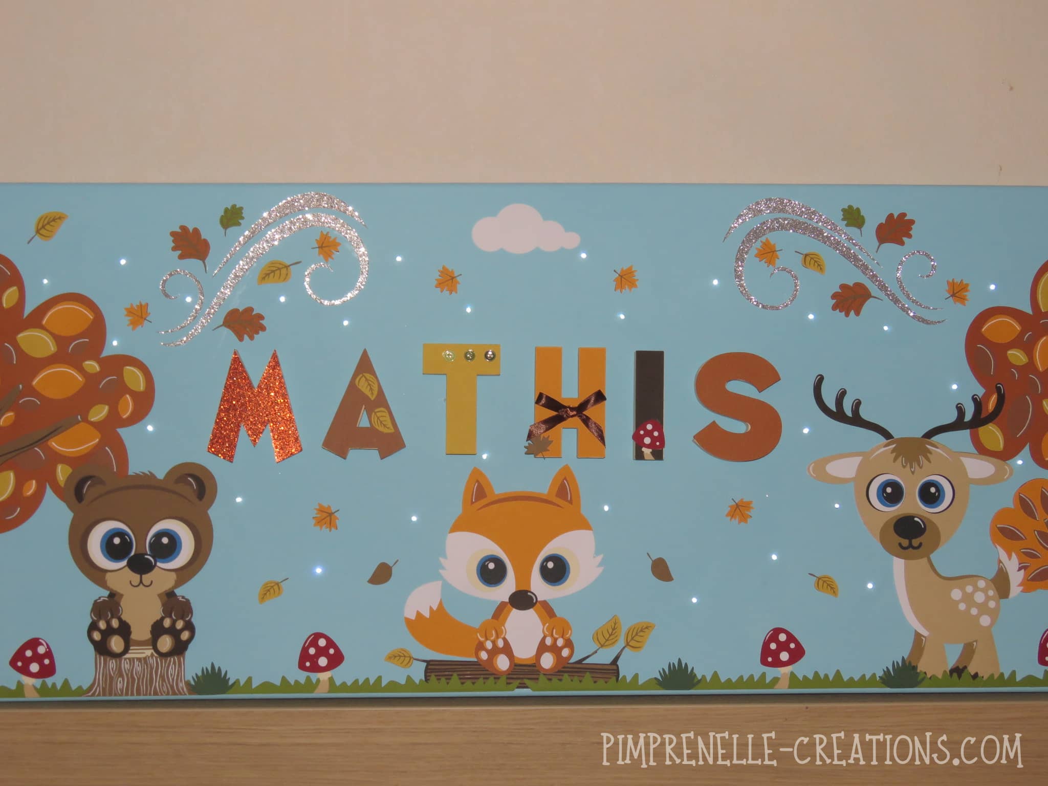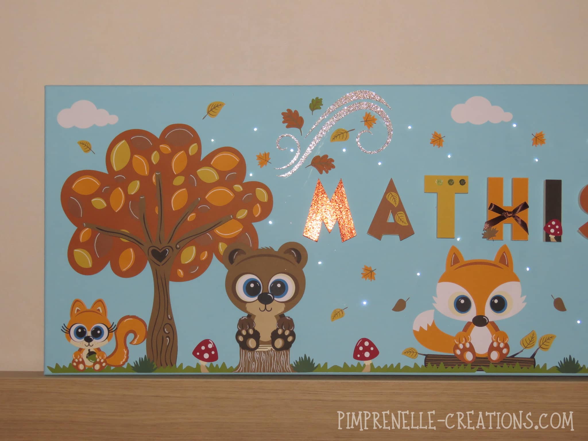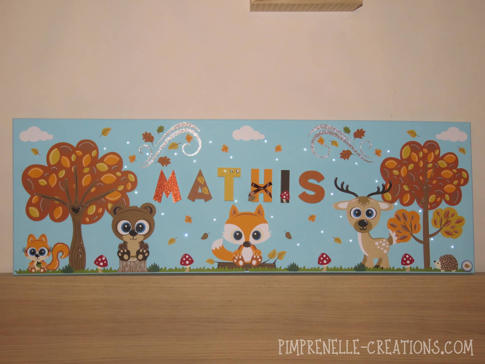 Tableau lumineux personnalisé géant avec renard, cerf, ours et écureuil. Cadre lumineux géant avec prénom “à la rencontre des animaux de la forêt”