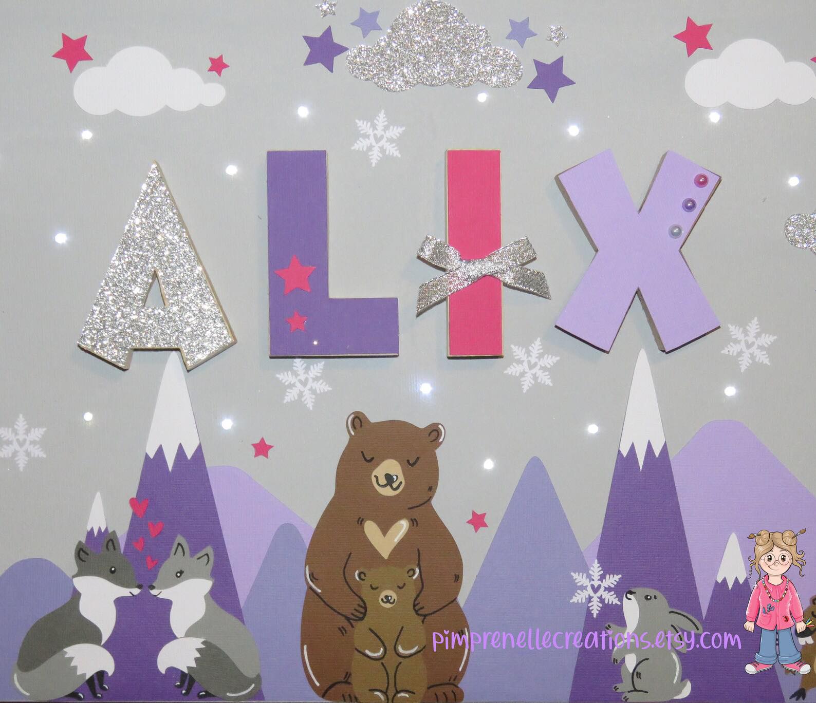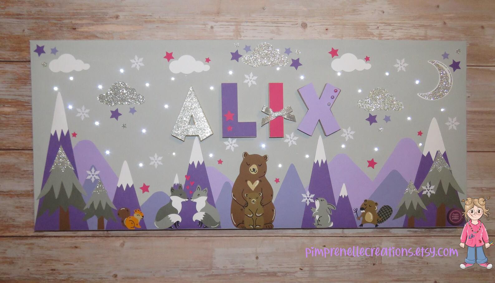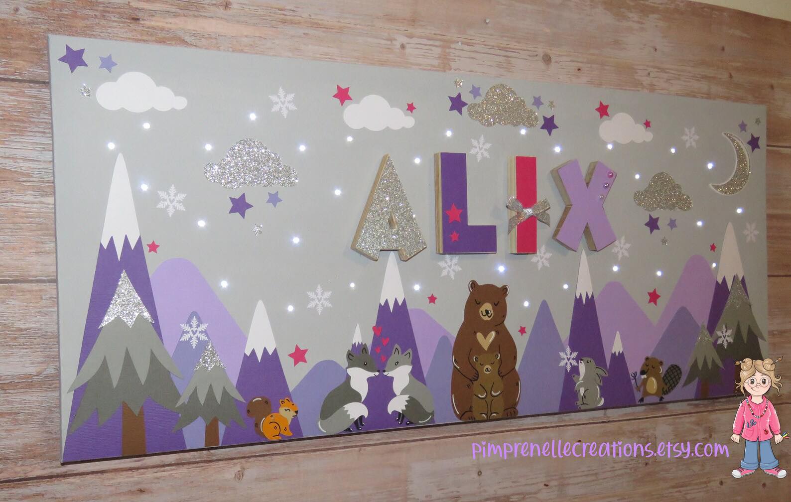 Tableau lumineux avec prénom et montagnes mauve. Toile lumineuse avec prénom et animaux du Canada.