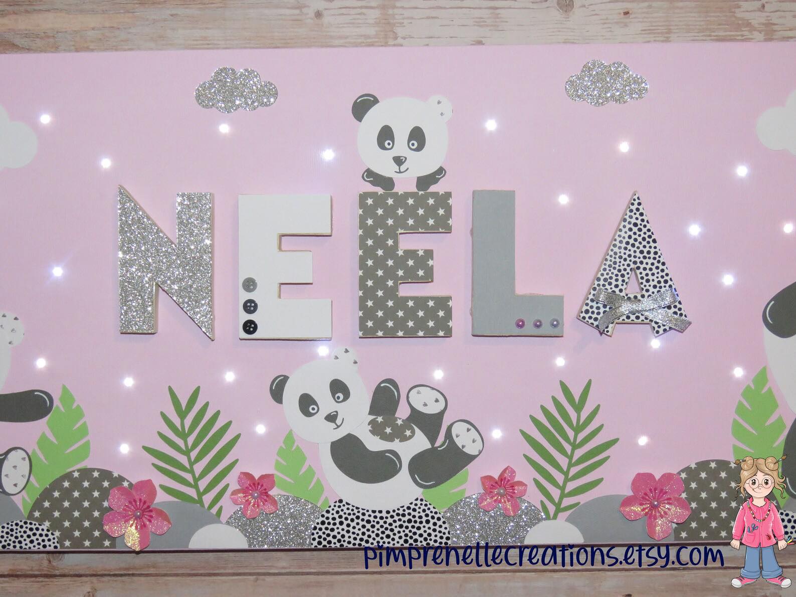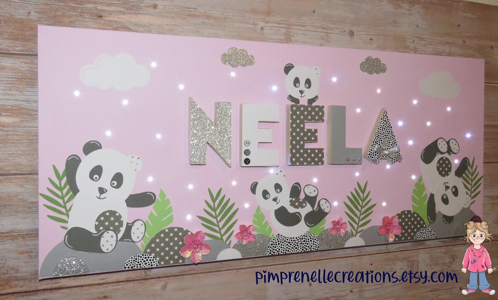 Tableau lumineux rose avec prénom et doudou panda Chao Chao. Toile lumineuse avec prénom et doudou panda.